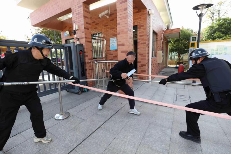 演练现场模拟“暴恐分子”强行闯入校园的突发场景,学校迅速启动应急预案。安保人员第一时间手持钢叉、盾牌等防暴器械,沉着与“暴徒”周旋对峙。各班级教师反应迅速,有序引导学生快速撤回教室,紧闭门窗,并用桌椅、拖把等物品构筑简易防御工事。危急时刻,警方火速赶到现场,成功将“暴徒”制服。
