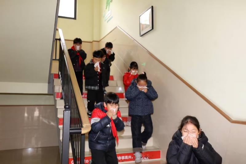 随着校园广播消防警报声响起,演练正式启动。老师们第一时间组织学生用润湿的毛巾掩住口鼻,低姿弯腰,按照预定路线成两路纵队有序撤离。各楼层、楼梯口值守老师全程在岗,维护疏散秩序,严防拥挤、踩踏等意外发生,全程护航师生安全撤离。